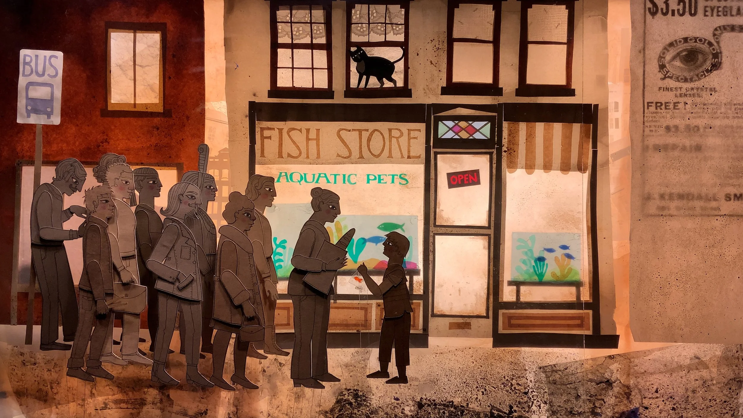 MISOPHONIA is a richly layered world that transcends the humble discarded materials it’s made from. Filmed with live-performed puppetry on a multiplane stage, puppets made from pizza boxes move through cityscapes of vintage papers and painted cellophane, immersed in an ever building atmosphere of sound.